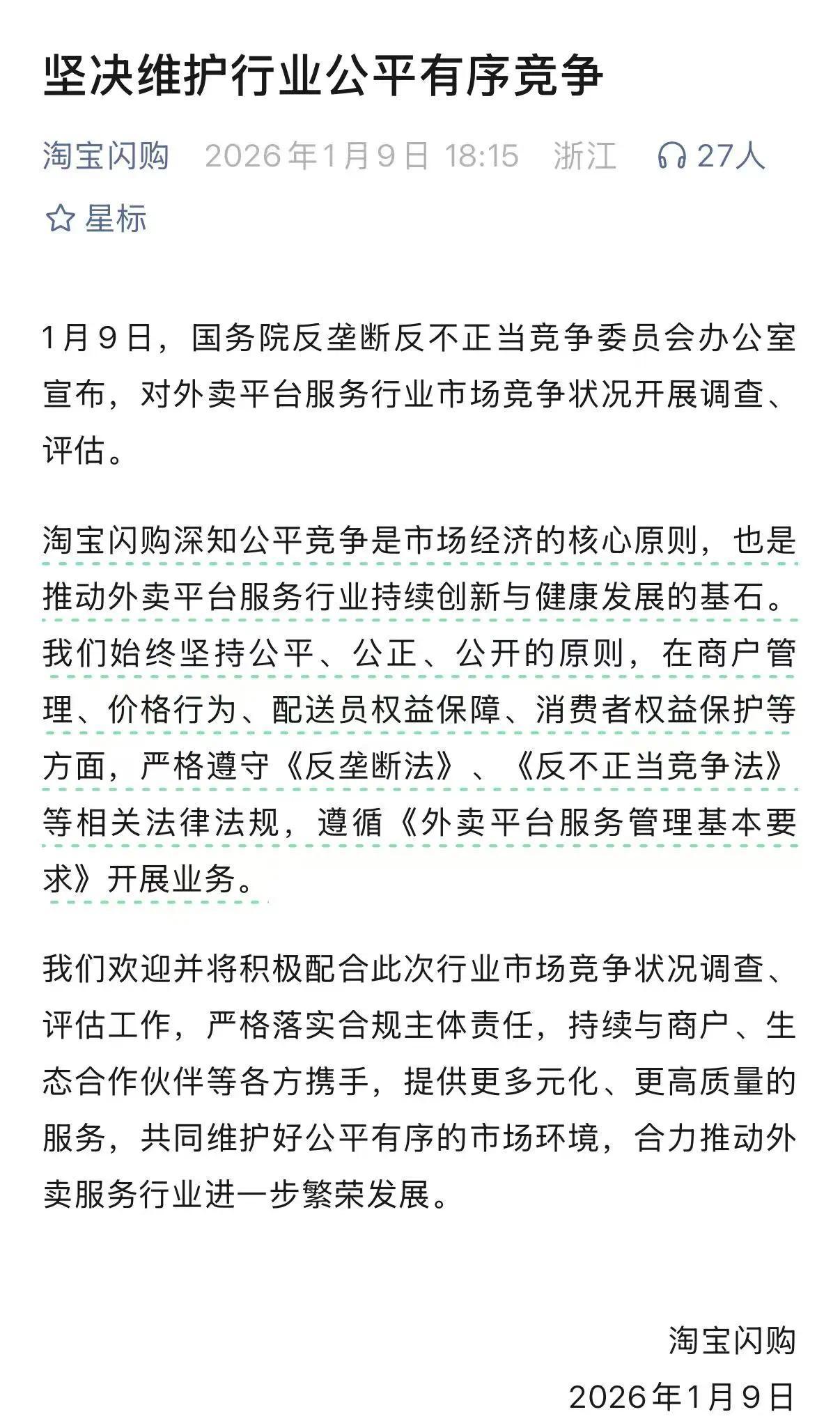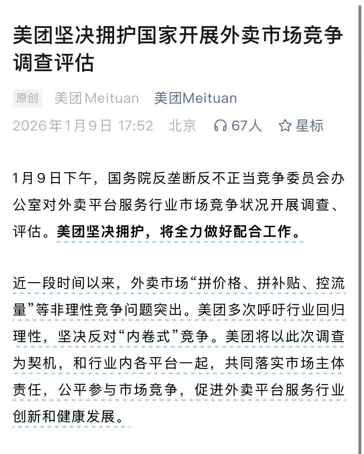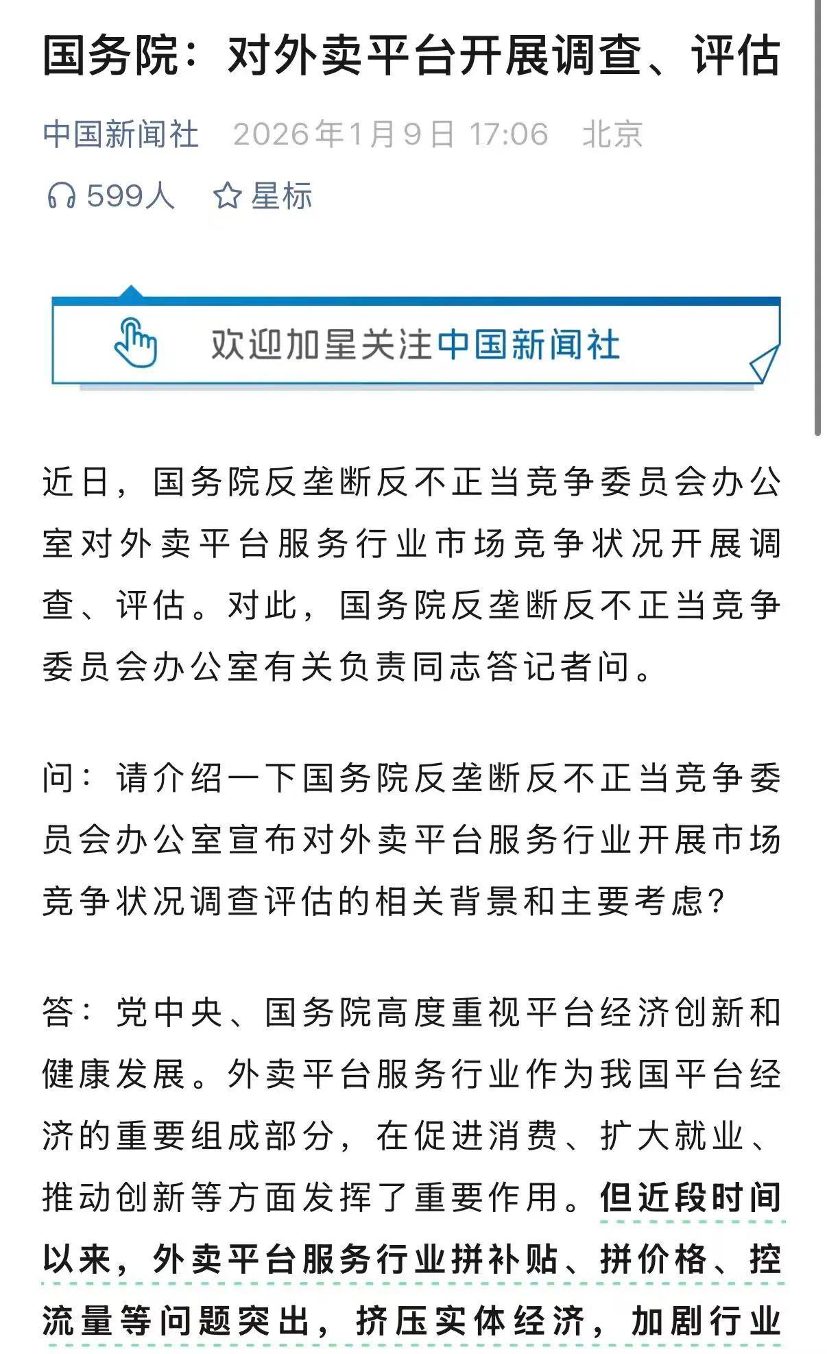 前天阿里Q4业绩前瞻刚刚出来,特别强调坚定加大淘宝闪购的投入以达到市场绝对第一,昨天反垄断反不正当竞争监管部门要对外卖行业进行调查的新闻就出来了。